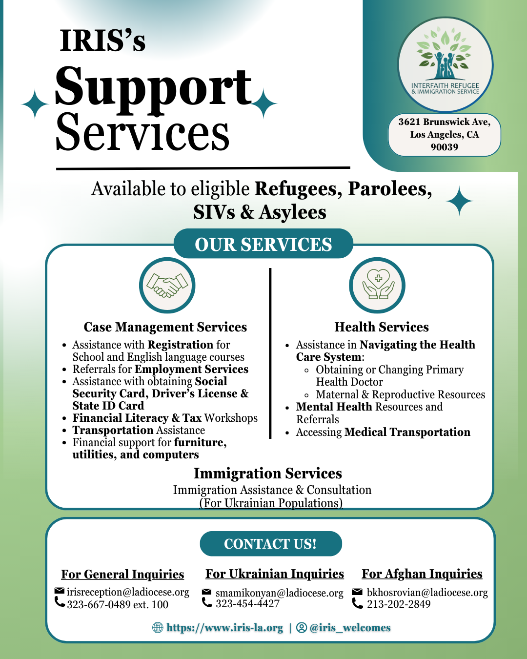 Eligible populations can include LGBTQ+ refugees, Special Immigrant Visa(SIV) holders, individuals paroled as refugees or asylees(Ukrainians, Afghans, etc.), Cuban and Haitian entrants, certain Amerasians from Vietnam, trafficking survivors(T-Visa), and certain Lawful Permanent Residents. Please contact irisreception@ladiocese.org for more information.